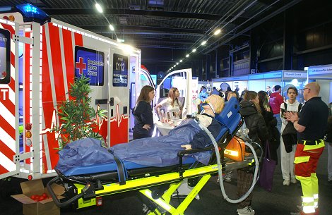 Männliche Bewerber machten sich am Tarnzelt der Bundeswehr mit der Körperschutzbekleidung am Kampfanzug vertraut. Sie führten einige Probeschläge auf die Schutzweste aus und waren erstaunt, wie schmerzhaft das dann doch eher für den Angreifer sein kann. Interessant auch der blinkende Rettungswagen vom "Roten Kreuz" aus Wesel, Einblicke in die Ausstattung des Fahrzeuges gewährte und man mit der Übungspuppe den Liegendtransport und gleichzeitige Beatmung demonstrierte.